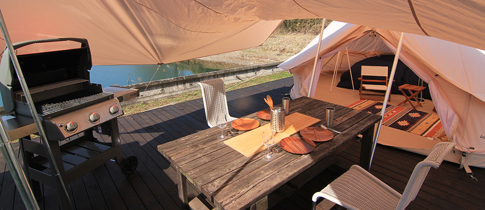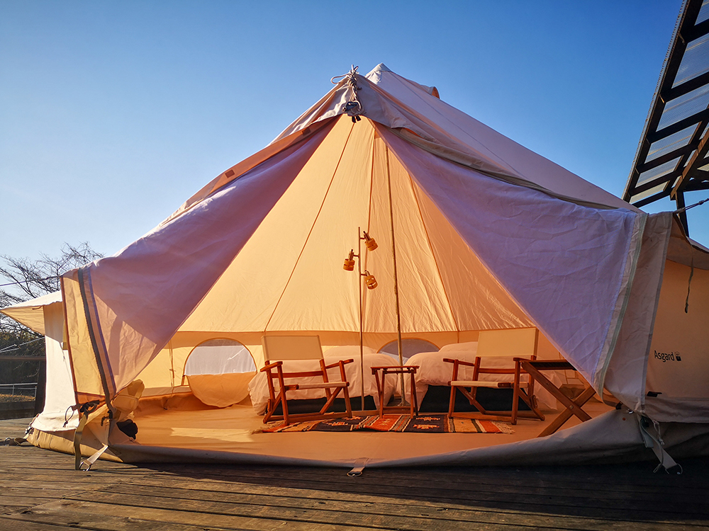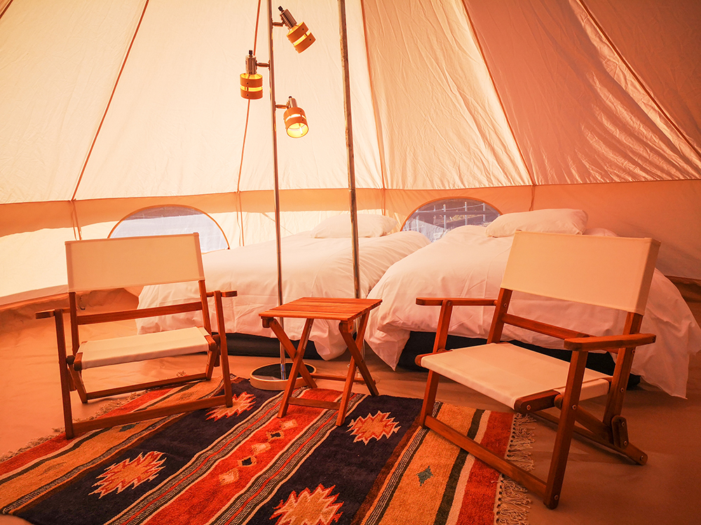 | 定員4名。エアーベッドをご用意しておりますので夜は快適に眠ることが出来ます。テント内には電源もございます。扇風機やスポットクーラー、電気毛布、ファンヒーター等もご用意しておりますので、オールシーズンで快適にお過ごし頂けます。ご家族やお友達、大切な方と、心ときめく時間をお楽しみ下さい。 |