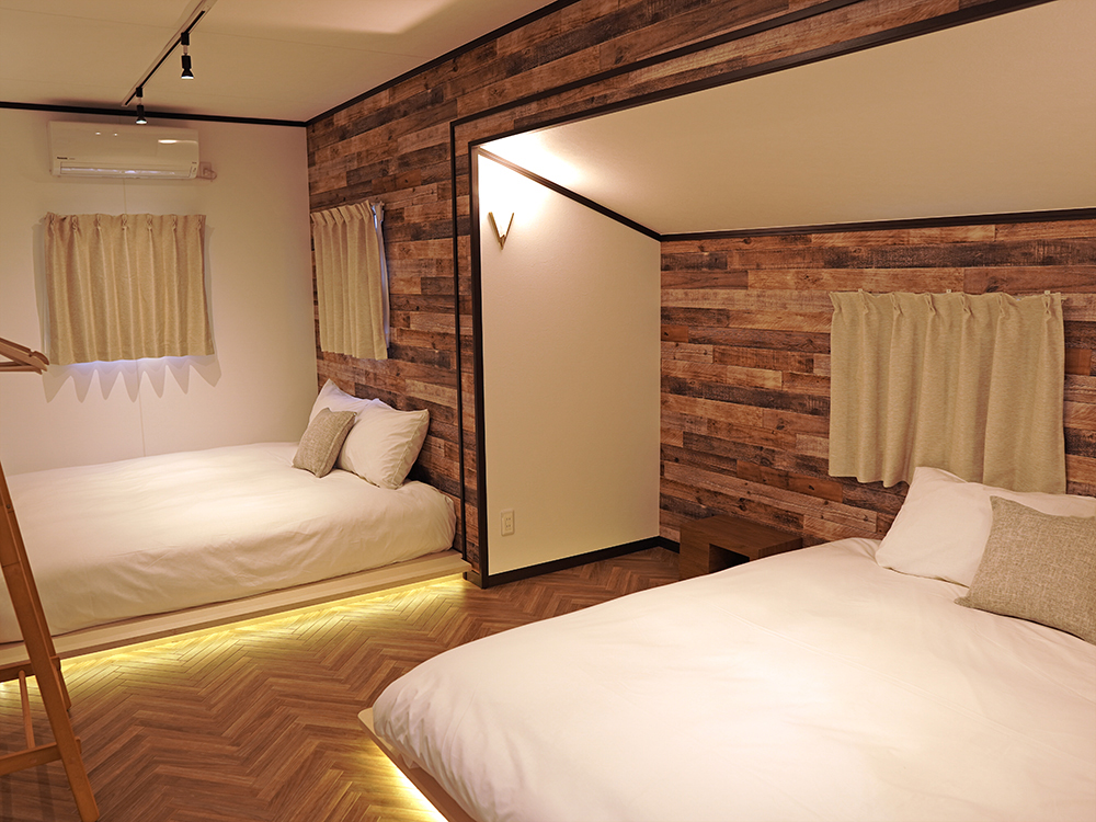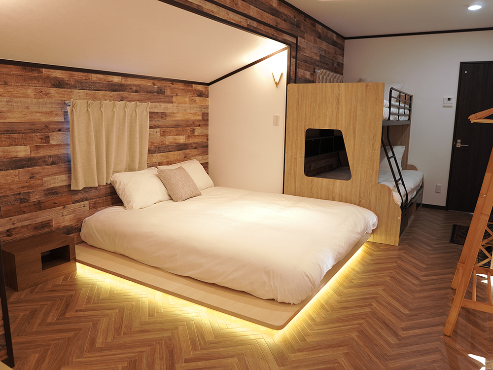| オーダーメイド特注サイズベッド(幅180×長さ205)2台に加え、上段1名、下段2名(※)が就寝可能な2段ベッド1台 寝具にはアレルギー対策にもこだわりを持ち、ポリエステル素材の布団・枕を導入 多人数で至高な時をお過ごしください。 ※大人の場合は下段1名まで可。 |
